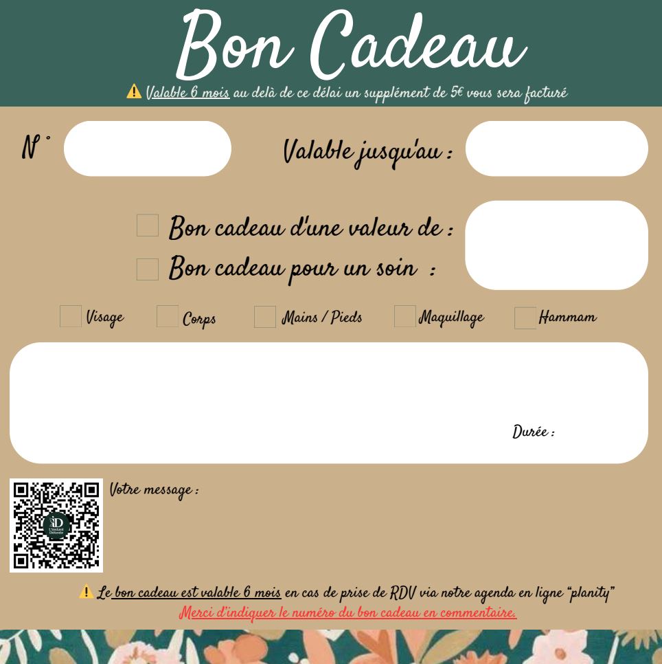 Un bon cadeau pour une occasion spéciale ou pour le plaisir de faire plaisir… On vous laisse le choix du montant de la carte cadeau, qui pourra être utilisée à l’institut.