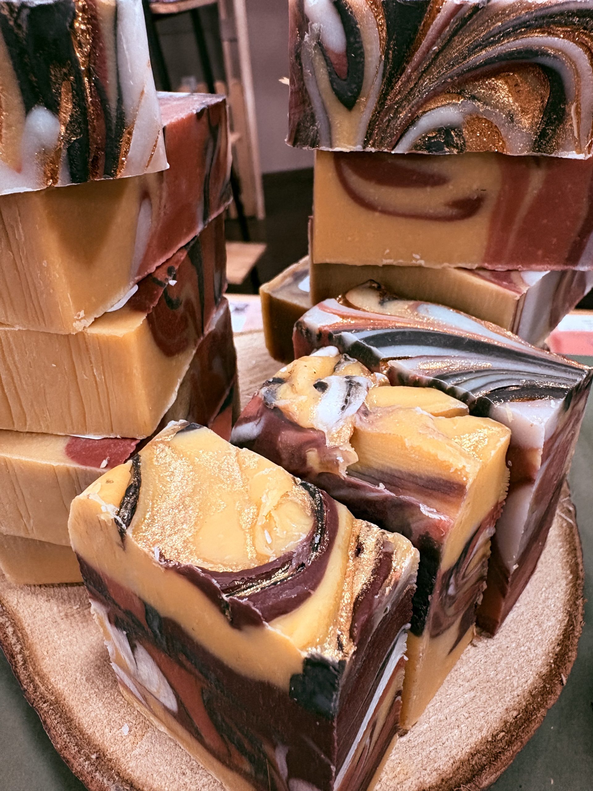 Savon au beurre de cacao et beurre de karité aux parfums chauds et doux d’agru mes, d’épices, de figue et résineux. Richement coloré avec des oxydes naturels. Le sommet des barres est agrémenté d’un brillant mica doré et de colorants alimentaires.